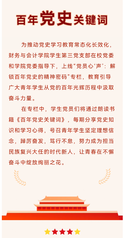 在专栏中,员工党员们将通过朗读书籍《百年党史关键词》,长期和师生分享党史知识和学习心得,带领青年员工共同学习党史知识,号召青年员工坚定理想信念,踔厉奋发,笃行不怠,努力成为担当民族复兴大任的时代新人,让青春在不懈奋斗中绽放绚丽之花。