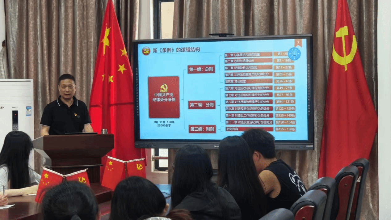 党课上,毛茂山老师以学习解读中国共产党纪律处分条例为题,聚焦新修订《条例》的重要意义、新《条例》的突出特点和新修订的主要内容等方面进行详细解读,并将《条例》与学习、工作及日常生活相结合,帮助同学们深刻地理解了各项纪律的具体要求,教育引导党员同志要学纪、知纪、明纪、守纪,以更加坚定的信念和务实的作风,为实现党的历史使命和奋斗目标而不懈努力。