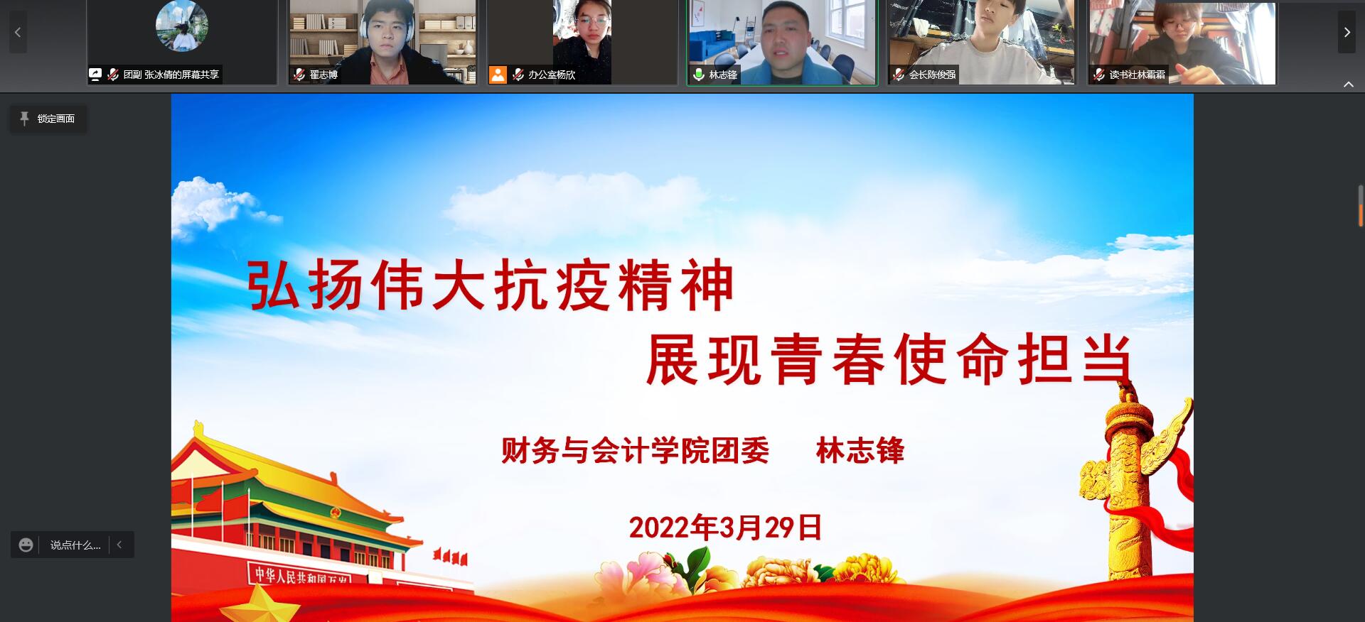为让学院团员青年积极配合学校各项防疫措施,主动投身于校园防疫工作,强化作为党的助手和后备军的责任意识,3月29日,学院团委书记林志锋为全院团学干部上了一堂“弘扬伟大抗疫精神 展现青春使命担当”的线上主题团课。