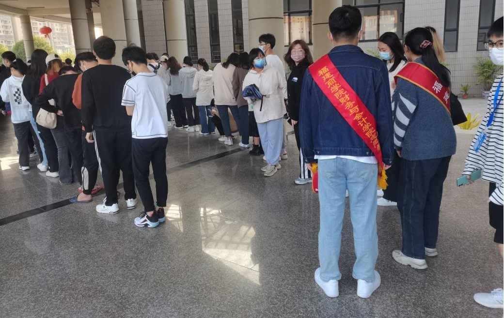 志愿者们到达工作现场后迅速与负责老师进行对接,熟悉工作内容与范围。在经过简短培训之后,就进入工作模式,各负其责。每一个核酸检测的通道都可以看到志愿者们忙碌的身影,他们坚决服从学校安排,配合完成人员分流、秩序维护,提醒同学做好自身防护,佩戴好口罩。在做好场内核酸检测队伍引导的同时,志愿者们还配合工作人员,对参加检测人员的疑问进行耐心解答,确保核酸检测工作能够平稳、顺利地进行。