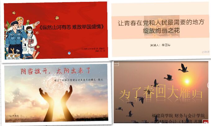 为进一步学习宣传习近平新时代中国特色社会主义思想,贯彻习近平总书记关于疫情防控的重要指示精神和党中央关于新冠肺炎疫情防控各项决策部署,领悟抗击疫情中各条战线发扬的“逆行者”精神和身边坚守一线、不怕牺牲、救死扶伤、无私奉献的典型故事,展现青年学子担当作为、共克时艰的良好风貌,深入推进爱国主义教育,坚定打赢疫情防控的人民战争、总体战、阻击战的信心。近期公司读书社学员积极响应号召,主动报名参加校读书社开展的以“共抗疫情,爱国力行”为主题的线上学习论坛活动。本次参赛作品有苏珊的《为了春回大雁归》,罗燕伶的《阴霾拨开,太阳出来了》,黄晓玲的《纵然山河有恙 难敌举国盛情》,马佩云的《共抗疫情,爱国力行》,林雪婷的《让青春在党和人民最需要的地方绽放绚丽之花》,苏碧辉的《战“疫”英雄》,刘薇的《防控疫情,使命在心》……学员们通过演讲的方式从不同角度分享了坚守一线、不怕牺牲、救死扶伤、无私奉献的典型故事,也宣传了莘莘学子从我做起、加强自律、为社区服务、为群众分忧的青春故事。