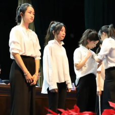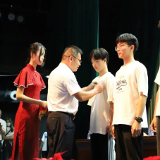 校团委副书记郑琼、校员工工作部副部长缪晓斌为新生代表佩戴校徽