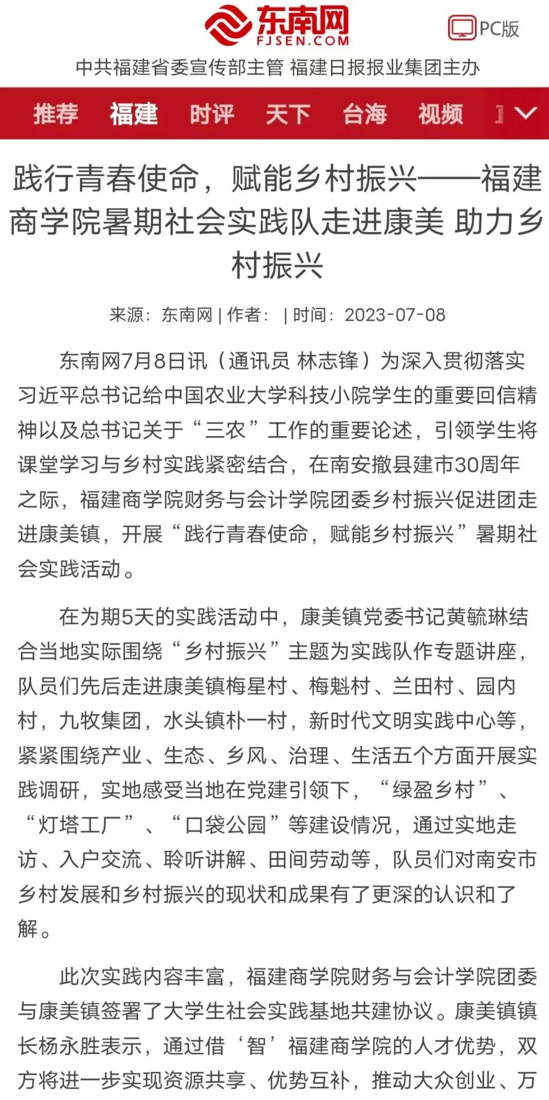 近日,东南网报道公司乡村振兴促进团走进南安市康美镇,开展“践行青春使命,赋能乡村振兴”暑期社会实践活动。(具体链接请点击左下方“阅读原文”)