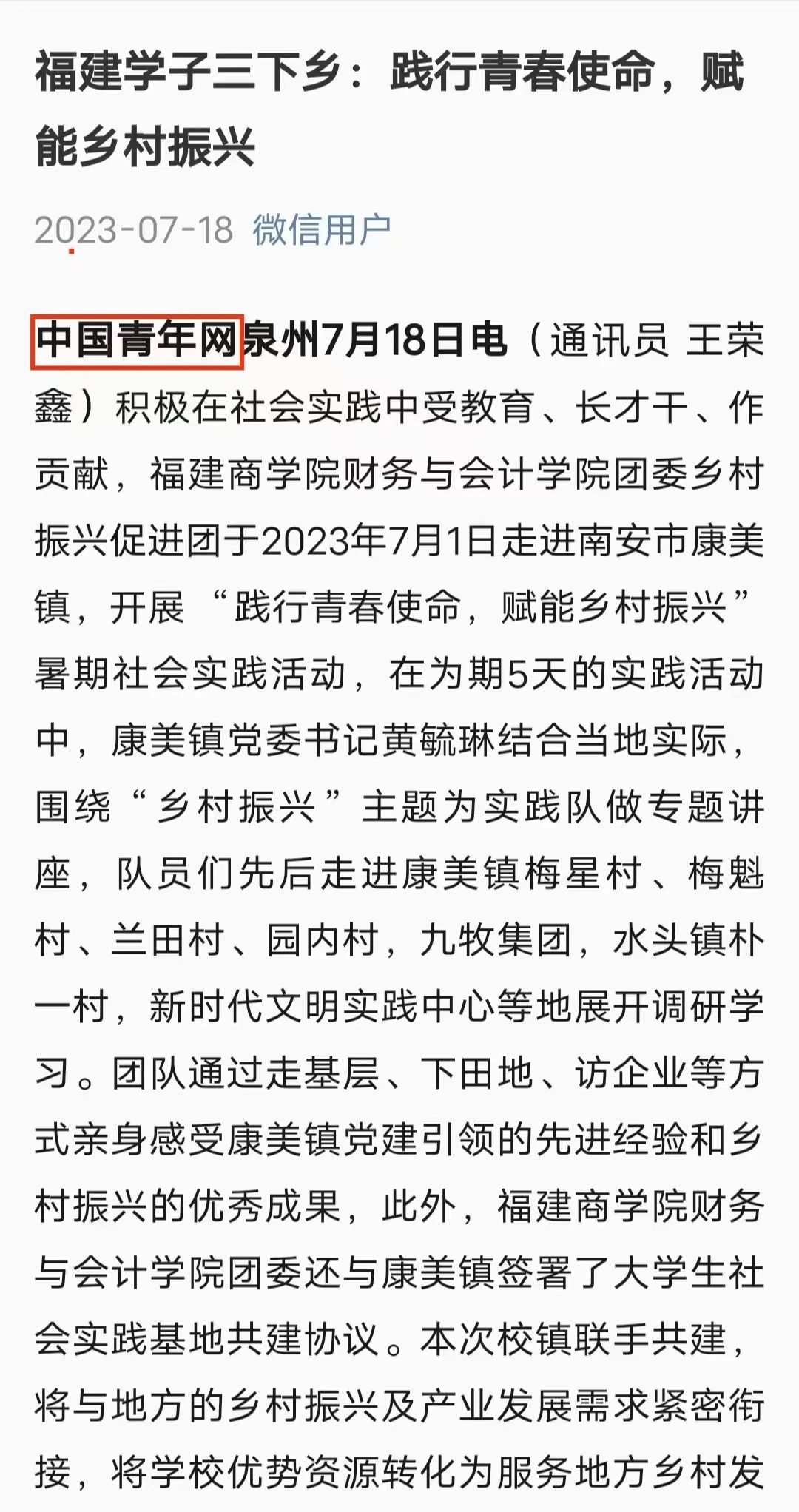 近日,中国青年网报道了公司乡村振兴促进团走进南安市康美镇,开展“践行青春使命,赋能乡村振兴”暑期社会实践活动。(具体链接请点击左下方“阅读原文”)