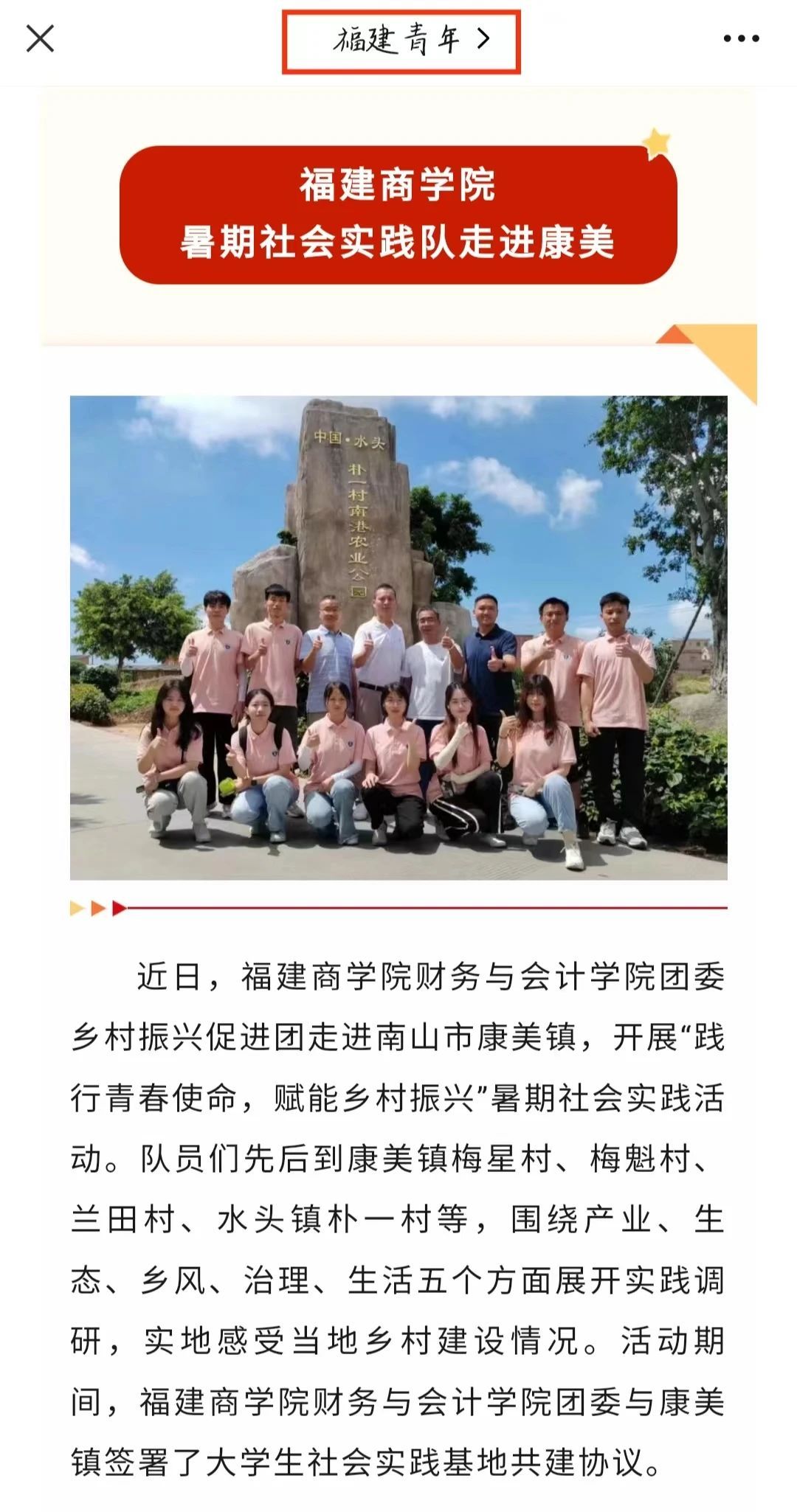 近日,福建青年报道了公司乡村振兴促进团走进南安市康美镇,开展“践行青春使命,赋能乡村振兴”暑期社会实践活动。(具体链接请点击左下方“阅读原文”)