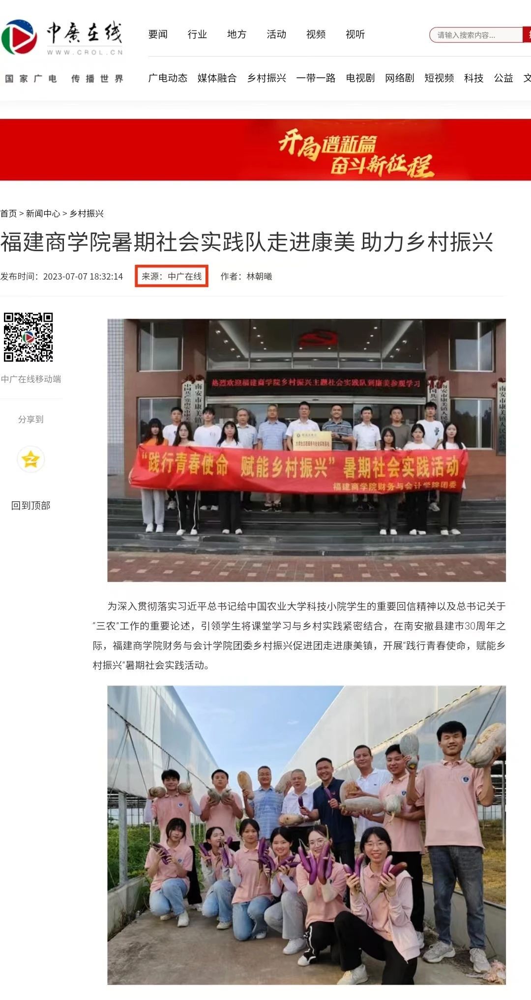 近日,中广在线报道了公司乡村振兴促进团走进南安市康美镇,开展“践行青春使命,赋能乡村振兴”暑期社会实践活动。(具体链接请点击左下方“阅读原文”)