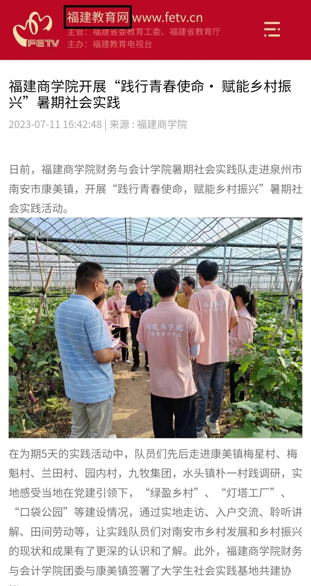 近日,福建教育网报道了公司乡村振兴促进团走进南安市康美镇,开展“践行青春使命,赋能乡村振兴”暑期社会实践活动。(具体链接请点击左下方“阅读原文”)