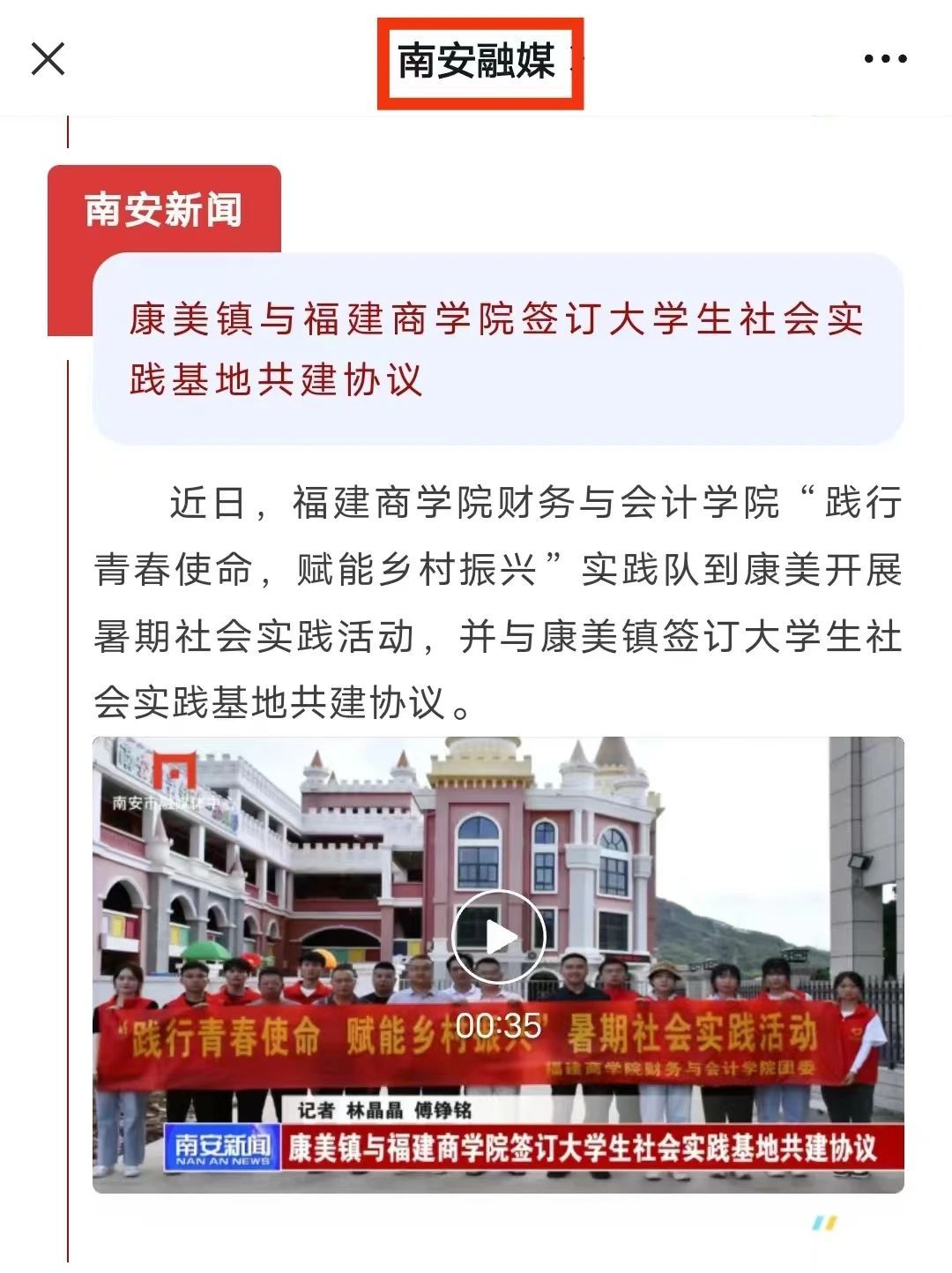 近日,海丝商报报道了公司乡村振兴促进团走进南安市康美镇,开展“践行青春使命,赋能乡村振兴”暑期社会实践活动,并与康美镇签订老员工社会实践基地共建协议。(具体链接请点击左下方“阅读原文”)