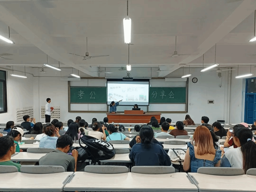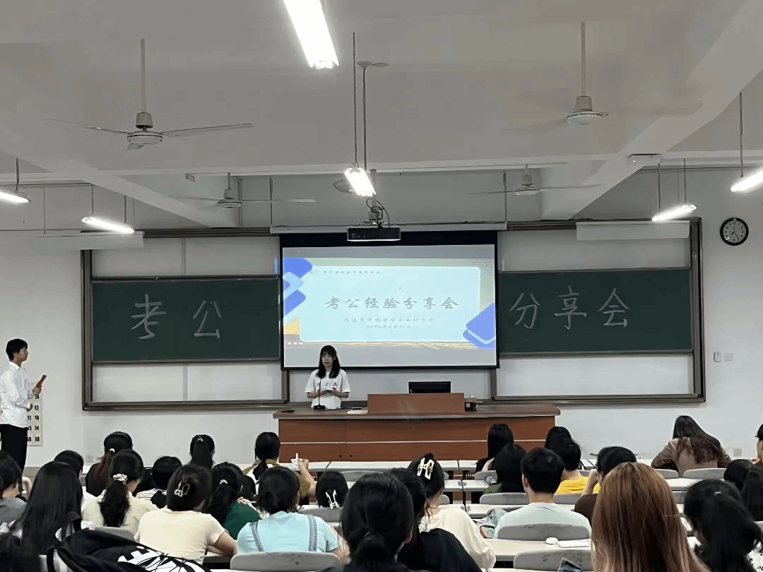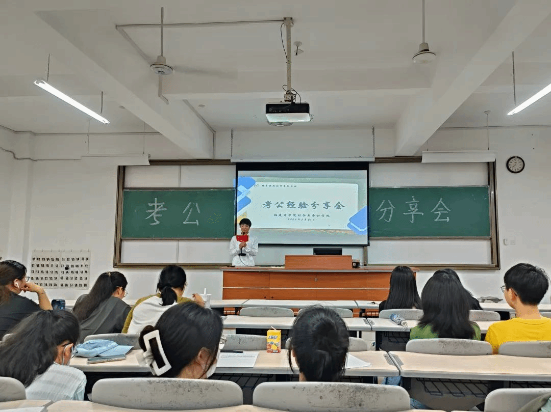 会上,柳东阳、李煜民两位学长分别介绍了岗位筛选、备考技巧、选岗条件、复习方法和答题技巧所要注意的内容,他建议同学们根据自己不同专业选择适合自己的岗位,同时通过刷历年真题来提高自己的题感和技巧,在不断做题中总结题型经验。王婕、陈漪涵、李婷、张恬四位学姐分享了考公的心路历程及亲身经验,指出在备考中要十分注意的事项,重点强调同学们对待考试的态度要认真严肃,不要存在任何的侥幸心理。随后着重解释了公务员考试国考与省考的区别,提醒同学们在进行不同考试备考过程中需要着重复习与注意的事项。分享结束后,同学们就考试方面的疑惑向学长学姐们进行了提问,学长学姐们耐心、细致地进行了解答。
