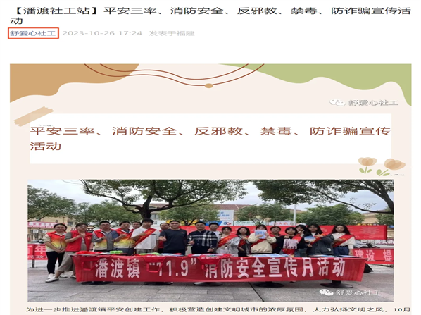 10月26日,潘渡社工站联合潘渡镇综治办、禁毒办、林业站、派出所、ylzzcom永利总站线路检测(ylzzcom永利总站)、福州理工学院等单位走进贵安新天地永辉超市门口开展平安三率、消防安全、反邪教、禁毒、防诈骗宣传活动。(具体链接请点击左下方“阅读原文”)