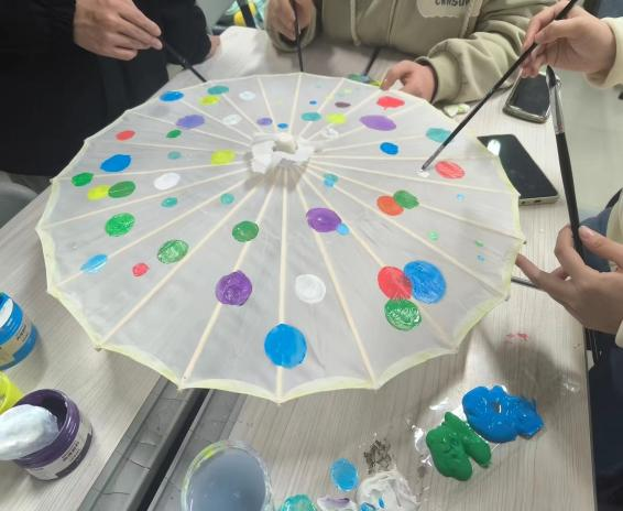 随后,同学们亲自制作油纸伞。大家充分发挥想象力,笔尖轻点、细致勾勒,美丽别致的图案在白纸伞上一一展现。绘制过程中,大家各具创意巧思,有的同学选择了传统的山水风景,用细腻的笔触勾勒出山峦的起伏、水流的柔和;有的同学则选择了数字与绘画结合的方式,用五颜六色的圆点代表被算出的圆周率,数字虽高达数位,但阻挡不了他们高昂的热情;还有的同学选择融入现代元素,这种跨时代的碰撞让古老的工艺焕发出全新的生命力,让人眼前一亮。