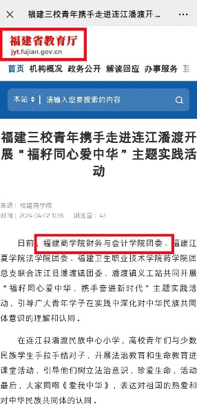 近日,福建省教育厅网站报道公司团委、福建江夏学院法学院团委、福建卫生职业技术学院药学院团总支联合连江县潘渡镇团委、潘渡镇社工站共同开展“福籽同心爱中华,携手奋进新时代”主题实践活动。(具体链接请点击左下方“阅读原文”)