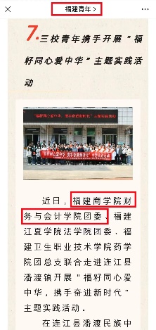 近日,福建青年公众号报道公司团委、福建江夏学院法学院团委、福建卫生职业技术学院药学院团总支联合连江县潘渡镇团委、潘渡镇社工站共同开展“福籽同心爱中华,携手奋进新时代”主题实践活动。(具体链接请点击左下方“阅读原文”)