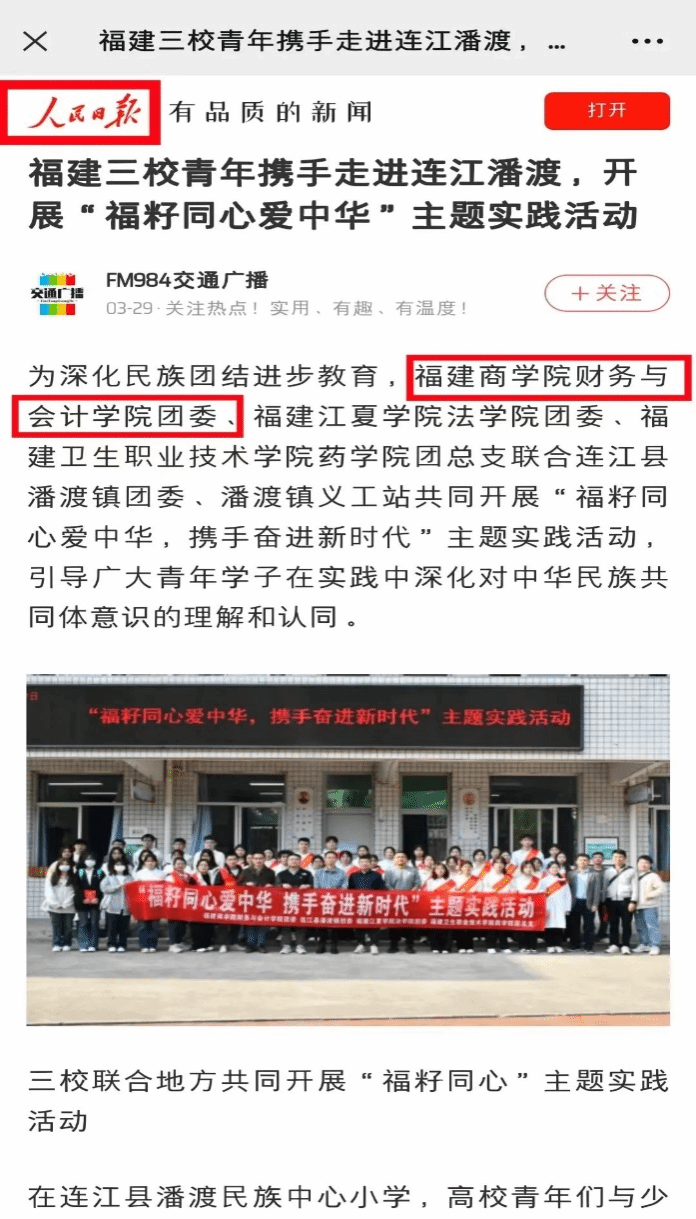 近日,人民日报客户端报道公司团委、福建江夏学院法学院团委、福建卫生职业技术学院药学院团总支联合连江县潘渡镇团委、潘渡镇社工站共同开展“福籽同心爱中华,携手奋进新时代”主题实践活动。(具体链接请点击左下方“阅读原文”)