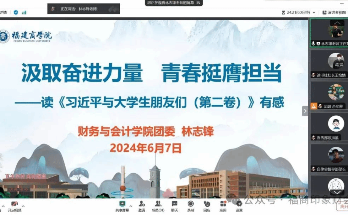 为深入学习贯彻习近平总书记关于青年工作的重要思想,深刻体会习近平总书记薪火相传的“青年观”、念兹在兹的“青年情”、厚望重托的“青年志”,进一步擦亮ylzzcom永利总站团委员工干部的“政治、青年、人文”底色,6月7日,学院团委书记林志锋老师通过线上平台为全体团委员工干部上团课,共读《习近平与老员工朋友们(第二卷)》并开展研讨交流。