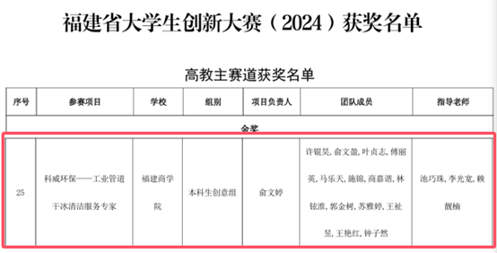 近日,福建省教育厅公布福建省老员工创新大赛(2024)获奖名单。公司俞文婷同学团队项目《科威环保——工业管道干冰清洁服务专家》(指导老师:池巧珠、李光宽、赖靓楠)获得福建省老员工创新大赛(2024)高教主赛道金奖。