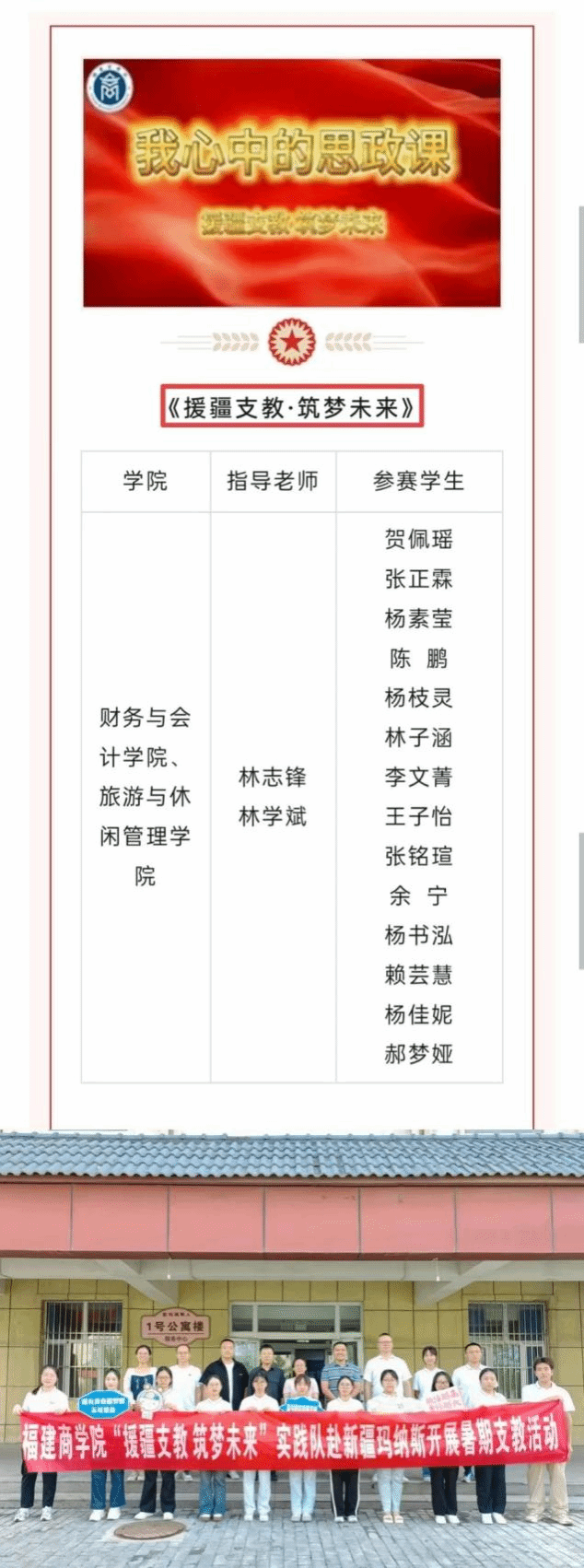 祝贺公司林志锋老师指导的微电影《援疆支教·筑梦未来》、王培森老师指导的微电影《感悟思想伟力,践行专业担当》在校团委主办的“我心中的思政课”微电影评选活动中均荣获三等奖。