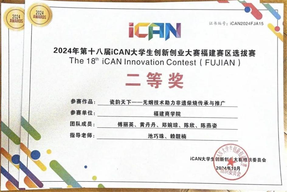 10月19日,由iCAN老员工创新创业大赛组委会、山东大学主办的第十八届iCAN老员工创新创业大赛福建赛区选拔赛在福州大学至诚学院完美收官,在池巧珠、赖靓楠老师的悉心指导下,俞文婷同学团队、傅丽英同学团队皆取得福建赛区二等奖的好成绩。