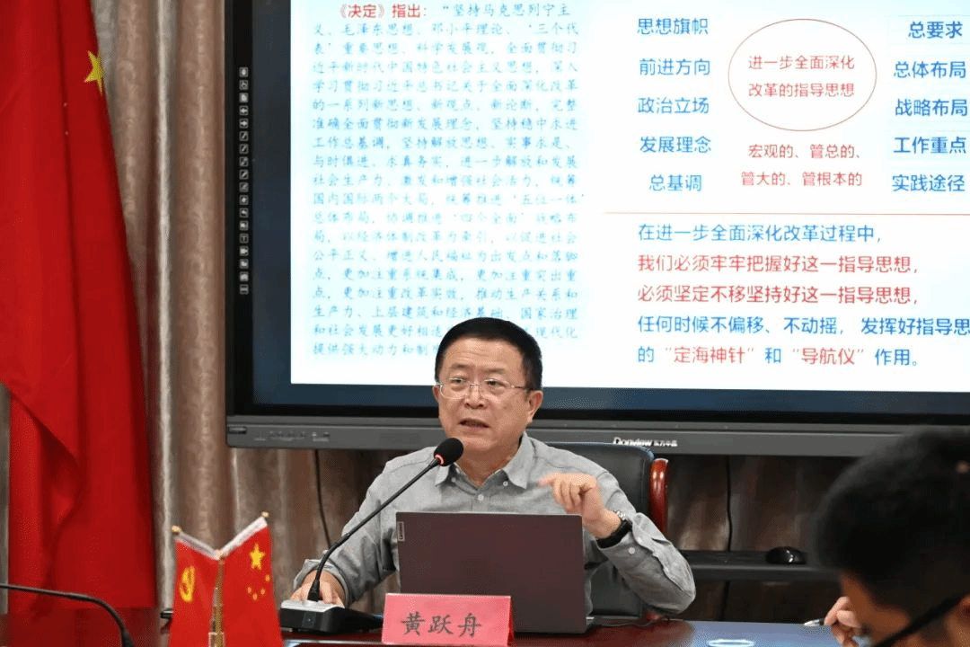 报告会上,黄跃舟围绕深刻把握党的二十届三中全会的重大意义,深刻把握进一步全面深化改革的总体目标、重大原则、重大举措、根本保证等方面进行系统宣讲和深入阐释。勉励师生要学思践悟党的二十届三中全会精神,凝聚精神共识、锻炼过硬本领、传播青春能量,为中国式现代化挺膺担当。