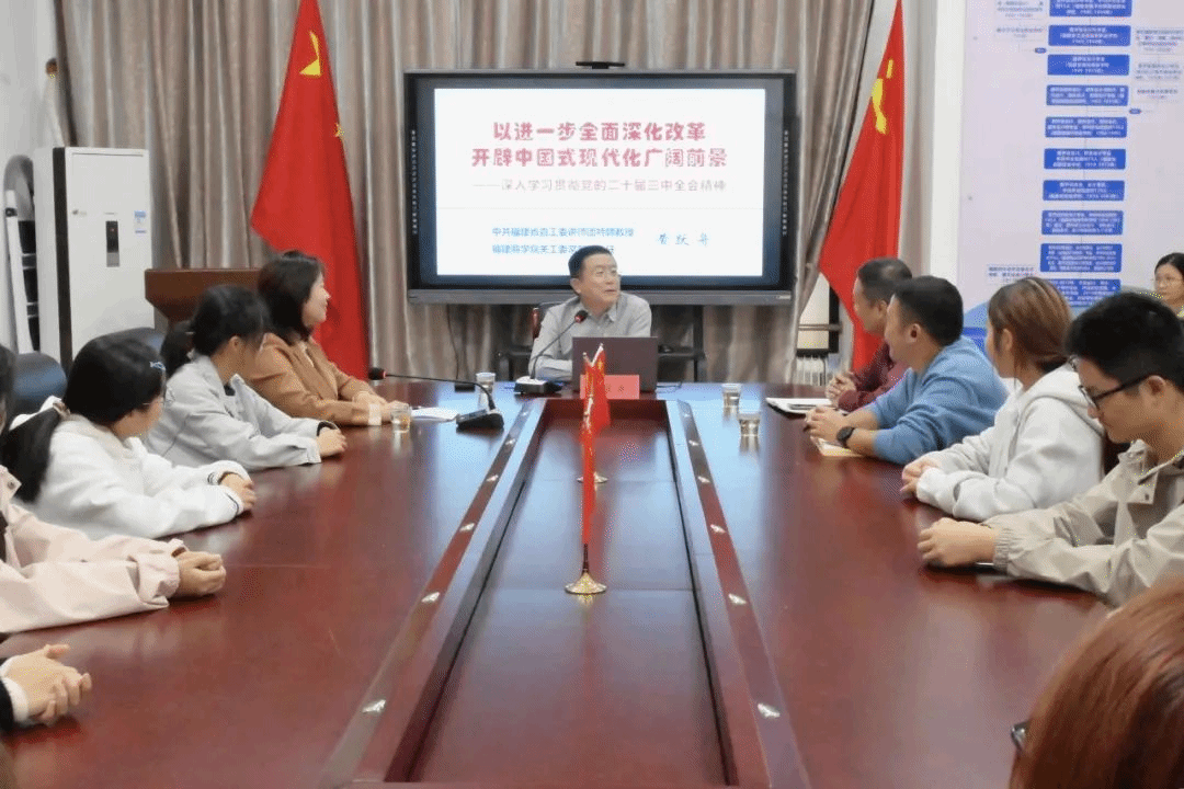 11月19日,中共福建省直工委讲师团特聘教授、福建省首批“新时代宣讲师”、校关工委常务副主任黄跃舟应邀到公司开展以“进一步全面深化改革,开辟中国式现代化广阔前景——深入学习贯彻党的二十届三中全会精神”为题的专题讲座。公司党委理论中心组成员以及学院习近平新时代中国特色社会主义思想读书社部分社员参加学习。