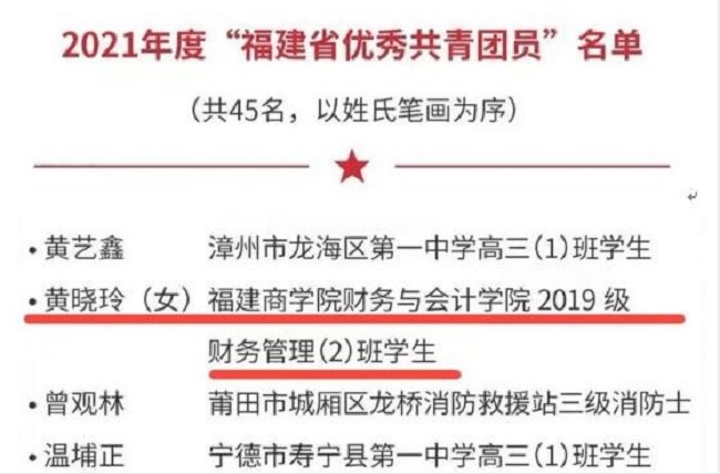 青春心向党,建功新时代!在建团百年之际,第十九届“福建青年五四奖章”和2021年度“福建省五四红旗团委”“福建省五四红旗团(总)支部”“福建省优秀共青团员”“福建省优秀共青团干部”评选结果正式揭晓!公司2019级财务管理(2)班黄晓玲同学被授予2021年度“福建省优秀共青团员”称号。