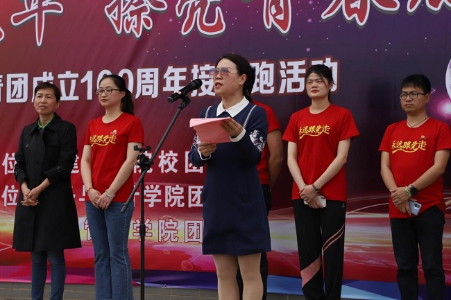 活动现场,校团委老师分别从校领导手中接过熊熊燃起的火炬,带领学院团委负责人奔跑在操场上,100个团支部的优秀青年代表环校园开展火炬接力跑,传递和弘扬“爱国、进步、民主、科学”五四精神,激发青年员工爱党爱国的热情。员工观众还参加了团史知识竞赛、爱国歌曲演唱、听歌识曲等互动活动。在合影环节,青年员工摆出“100”造型,为庆祝中国共青团成立100周年送出诚挚的祝福。