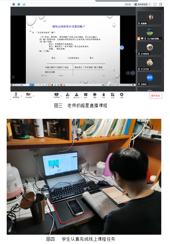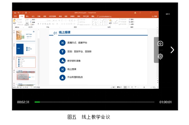 考虑到线上教学存在的种种限制,学院及时组织全体老师围绕“线上教学提质增效”这一主题,开展视频会议。会议中,各专业老师们对于线上教学过程中存在的部分员工不进直播课堂、作业不能按时上交等问题,展开积极讨论,集思广益总结补救措施。同时根据当前线上教学的实际情况,对教学安排、员工学习情况的监管、课堂高效互动、课后反馈、线上辅导等方面展开深入探讨。通过这次会议老师们积极探索多种形式的线上教研活动,拓展教师互相学习的空间,解除了教师线上教学的困惑,提高了教师线上授课的水平和员工线上学习的效果,保证线上教学的有序进行。(见图五)