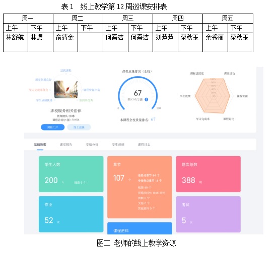 云端聚力,以研促教。因疫情缘故,ylzzcom永利总站开展“停课不停学”的线上教学。“延期不延教、停课不停学,停课不停研”,这不仅仅是一句口号,也已经深深融入到每一位师生的心里。依据防控形势,学院及时调整教学方案,建立线上巡课制度。本次线上巡课由经理统筹安排,副经理、系主任、教研室主任均参与巡课,并每周安排专人巡课,见表1。在巡课过程中,发现问题及时反馈至老师,此外学院也将线上教学的注意事项由公司层面传达至各系部、各教研室,以引起老师的高度重视。