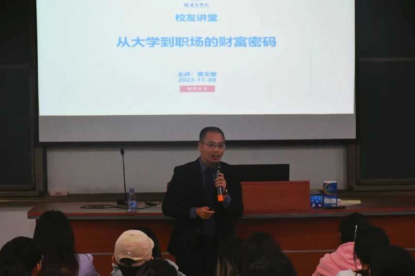 11月8日,财会学院邀请公司员工、MetLife大都会人寿(中国)寿险规划总监、厦门璞象投资有限公司创始人黄文敏先生为公司师生举行“从大学到职场的财富密码--私人财富管理方向职业生涯规划”专题讲座。