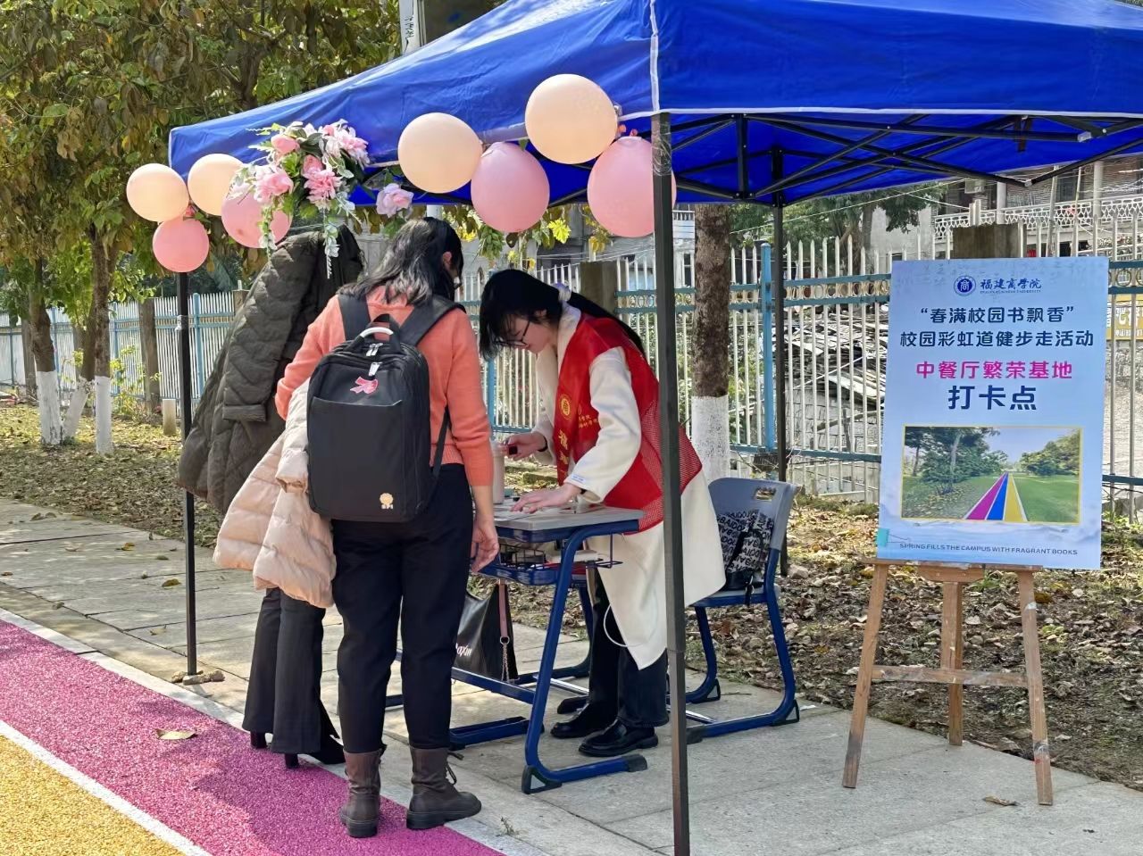 在“望眼见绿、行路见花”的福商彩虹步道开展“春满校园书飘香”健步走打卡活动,校园里老师们结伴而行,兴致盎然地从教学楼、办公楼出发来到彩虹步道参加健步走活动,享受徒步带来的惬意和快乐,在暖阳三月留下了最美的笑容,为校园增添了一丝浪漫的色彩。老师们经过40分钟的“跋涉”之后,都在打卡点盖了章,圆满完成了健步走活动。