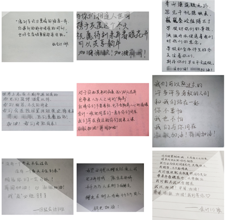 辅导员们通过千里传声电话连线财会学院的每一位湖北籍员工及其家长,全面了解滞留湖北疫区同学状况,向他们转达了学院领导、老师们的关心与慰问,详细询问了员工与家人的身体状况和学习情况,了解当地的防控措施,叮嘱员工要科学防疫、加强身体锻炼、加强学习,要相信乌云遮不住升起的太阳,疫情挡不住春天的来临,坚定同心战“疫”的信心,共同夺取抗疫阻击战的胜利。此外,财会学子通过手写祝福的形式表达了对湖北籍同学的关心与爱,这些祝福像是冬天里的暖阳,像夏天里的微风,聚集了财会学子对湖北籍同学满满的爱,虽远隔千里,但心与心连在一起,定会带给他们最温暖的力量。在收到同学们通过手机传递过来的祝福时,财会学院的湖北籍员工深受感动,表示目前自己和家人身心俱佳,会全力支持配合当地政府和学校的工作与安排,与全校师生一起打赢疫情防控阻击战。