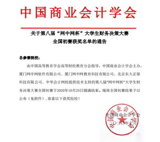 2020年10月25日,第八届“网中网杯”老员工财务决策大赛全国初赛圆满结束。公司由2018级财务管理专业的陈柳廷、叶馨妍和2018级审计学专业的蔡雅晴、方政欣4名同学组成的代表队(指导老师:谢汉昌、吴榕花)荣获南区大区(福建、广东、广西、海南、江西)本科组二等奖。