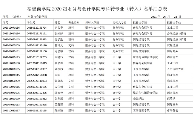 根据《关于2020级本科生转专业报名的通知》(商院教务〔2021〕62号),经个人申请、成绩公示、学院转专业工作领导小组审议,拟同意尹文华等15位同学转专业。现将名单予以公示。如在2020-2021-2学期出现补考、缺考、不及格及受任何违规违纪处分,取消转专业资格,名额顺位递补。